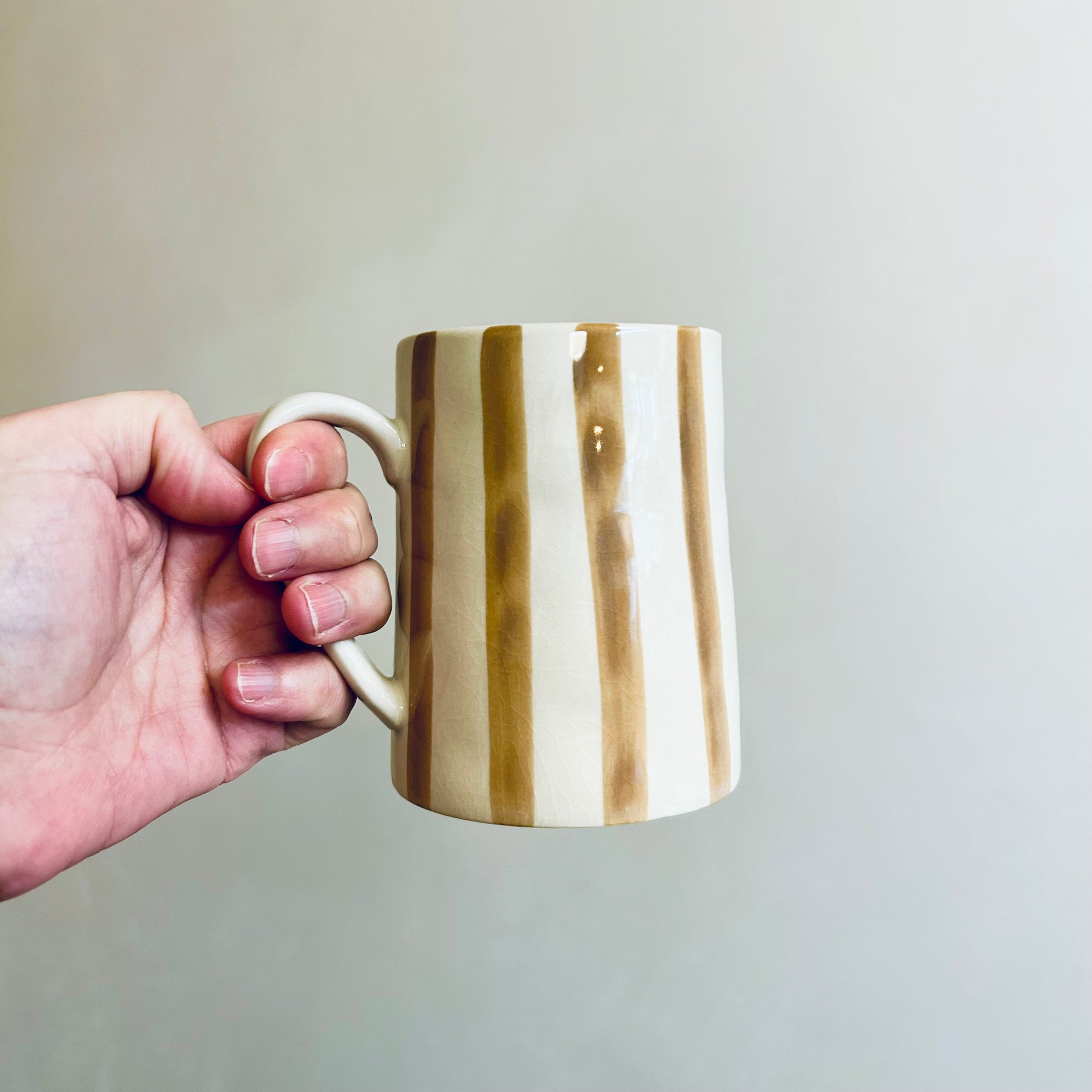 Tall long stripes in cream and tan. Start the day off right with the right mug. Perfect for a hot chocolate.