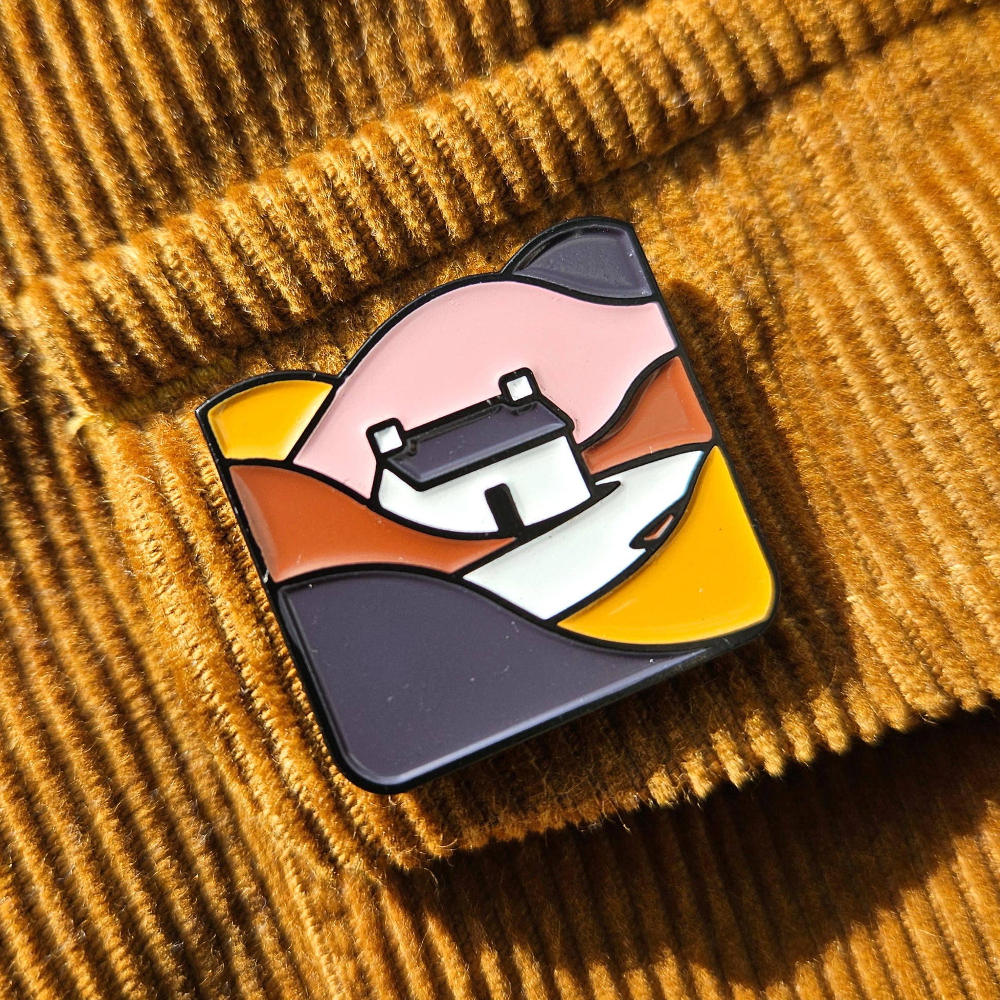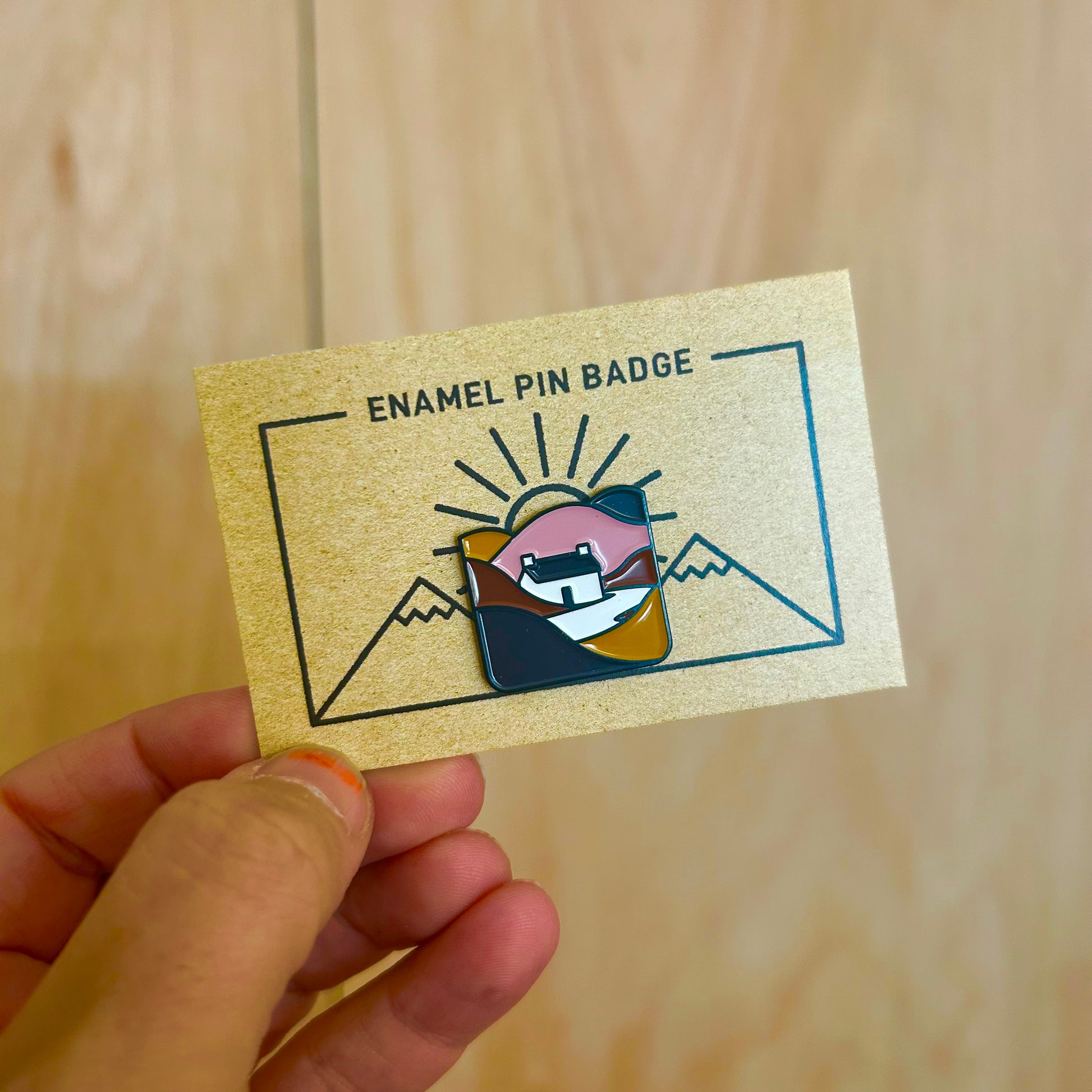 A cottage-themed enamel pin badge celebrating the great outdoors and the joy of hibernating in a cottage in the middle of nowhere!