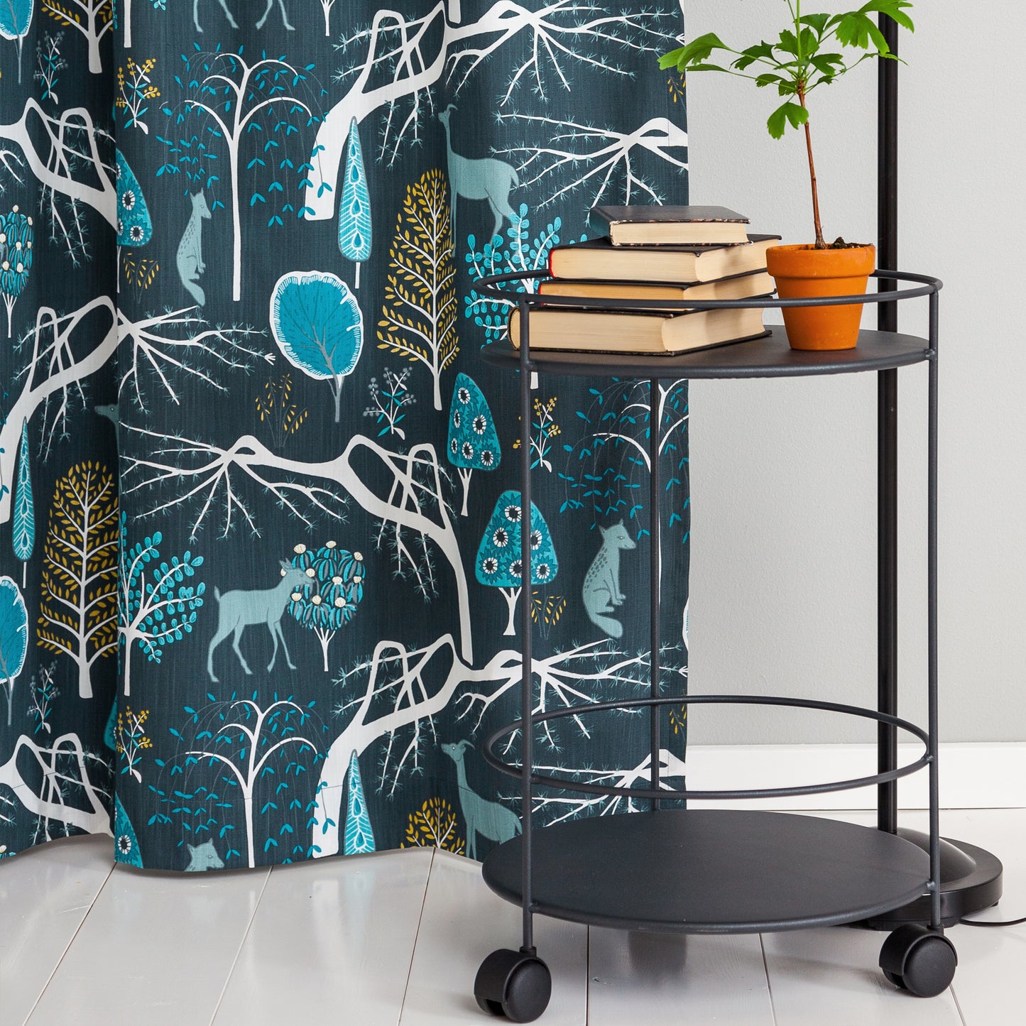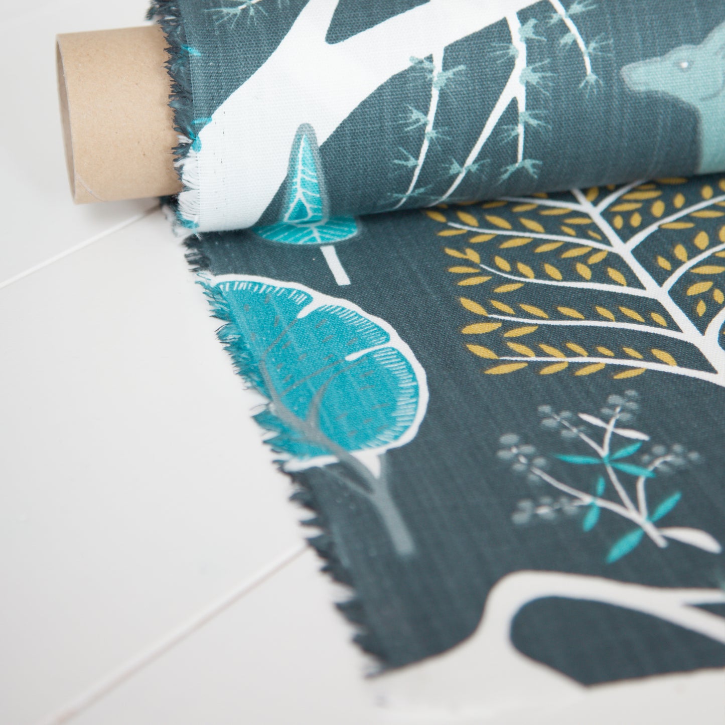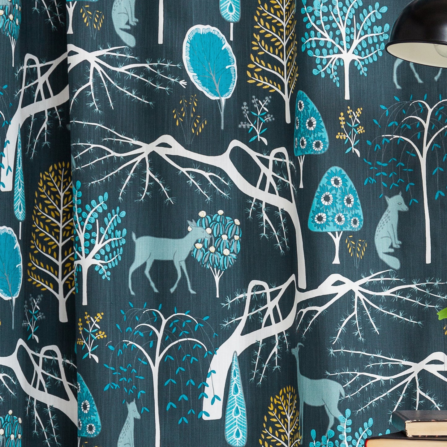 Amazing Scandinavian fabric. This Beautiful fabric features Sika deer, Kitsune foxes and blossom-laden trees. One of our best selling Swedish fabrics.